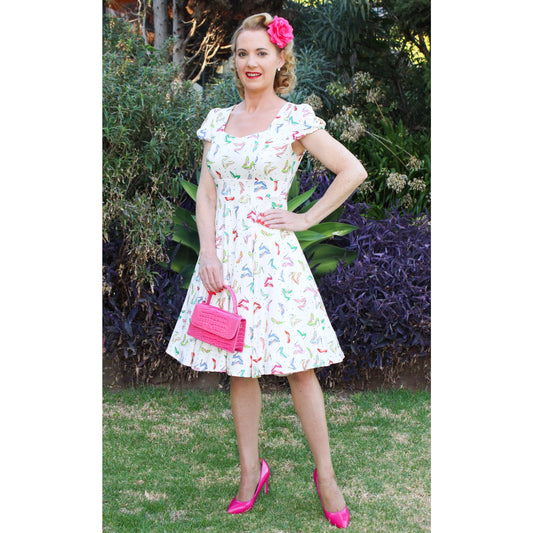 Claudia Cream Stiletto Print Swing Dress by Dolly & Dotty