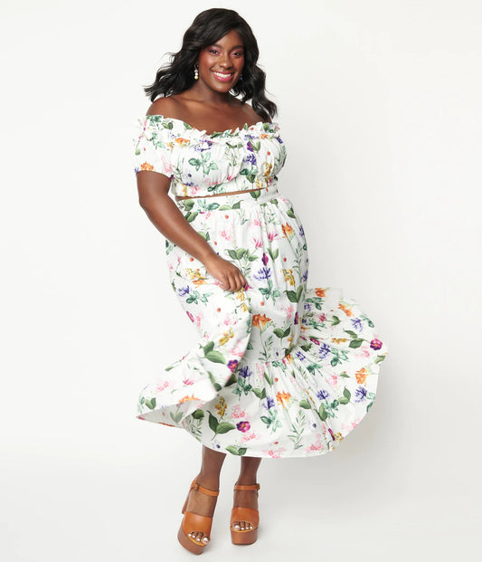 Plus Size White Garden Floral Print Midi Skirt by Unique Vintage