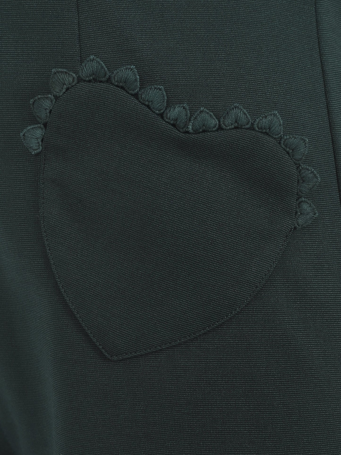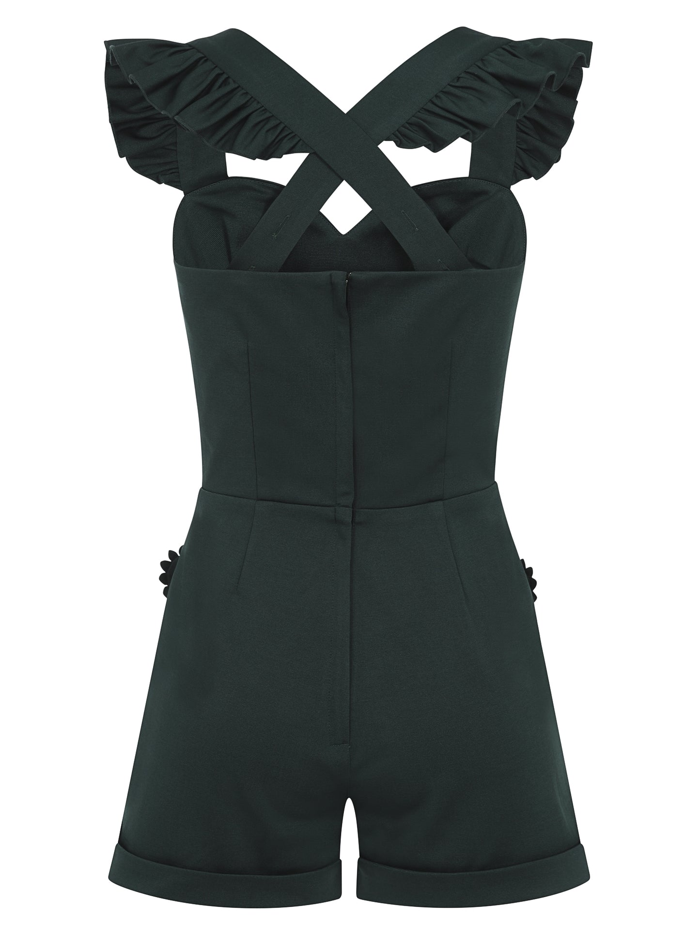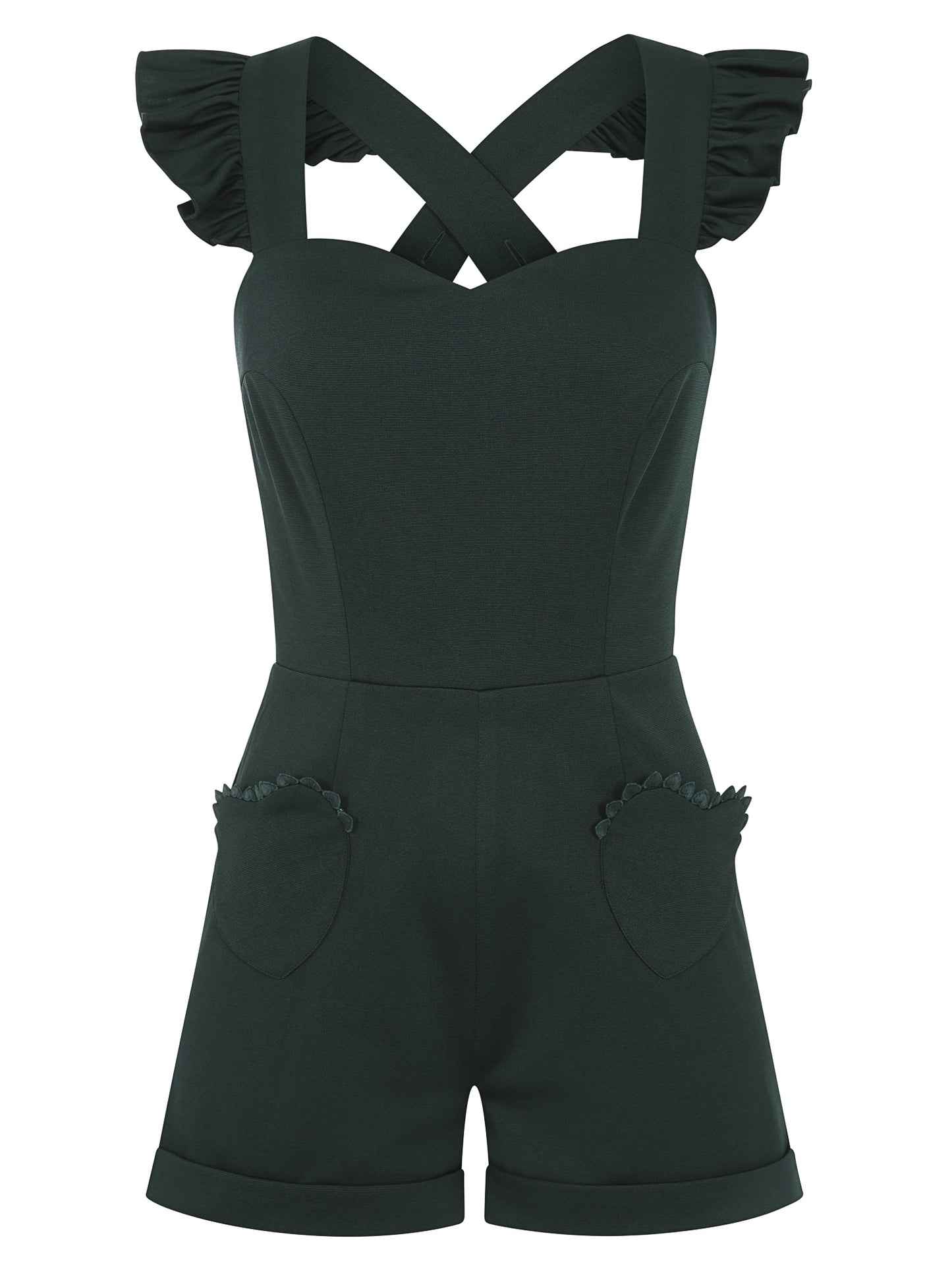 This retro playsuit has a flattering sweetheart neck and adjustable crossover shoulder straps with large, fabulous frilly frills! The shorts start at the natural waist, and end approximately on the upper thigh with a flattering turned up hem. The hips are adorned with adorable love-heart shaped patch pockets which have a love heart trim. She fastens via a covered centre back zip.