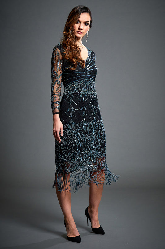 Tabitha Black/Blue Midi Embellished Flapper Dress från Jywal London
