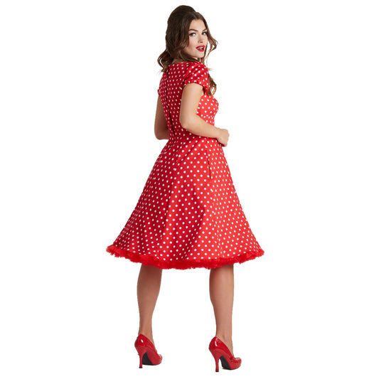 Claudia 50s Style Röd och vit Polka Swing Dress från Dolly & Dotty