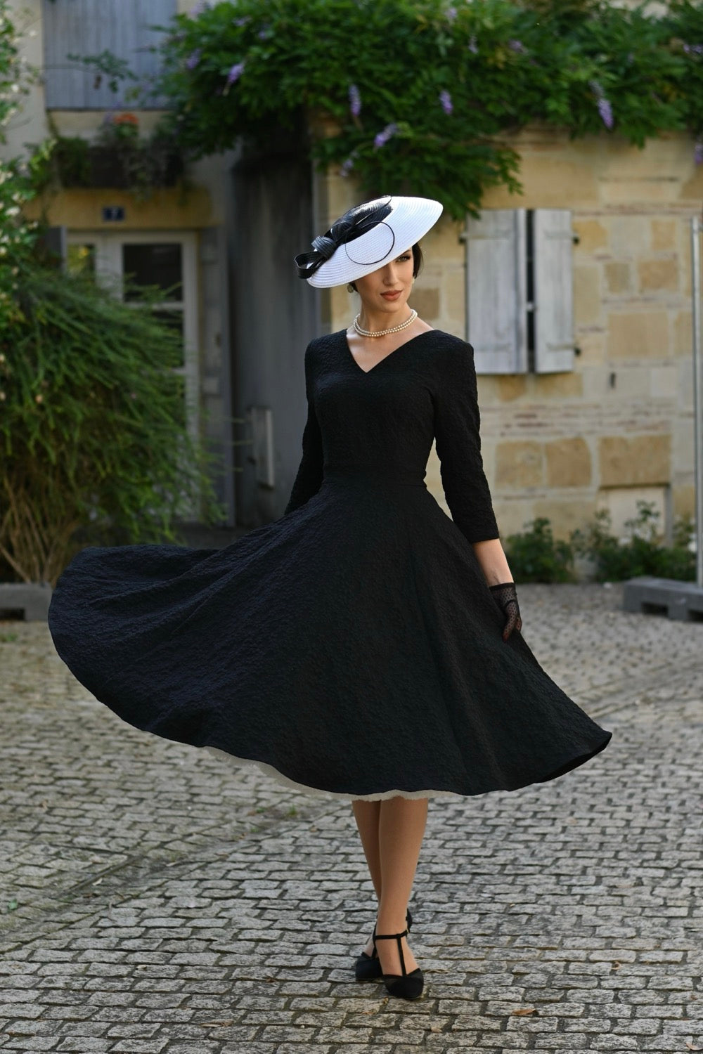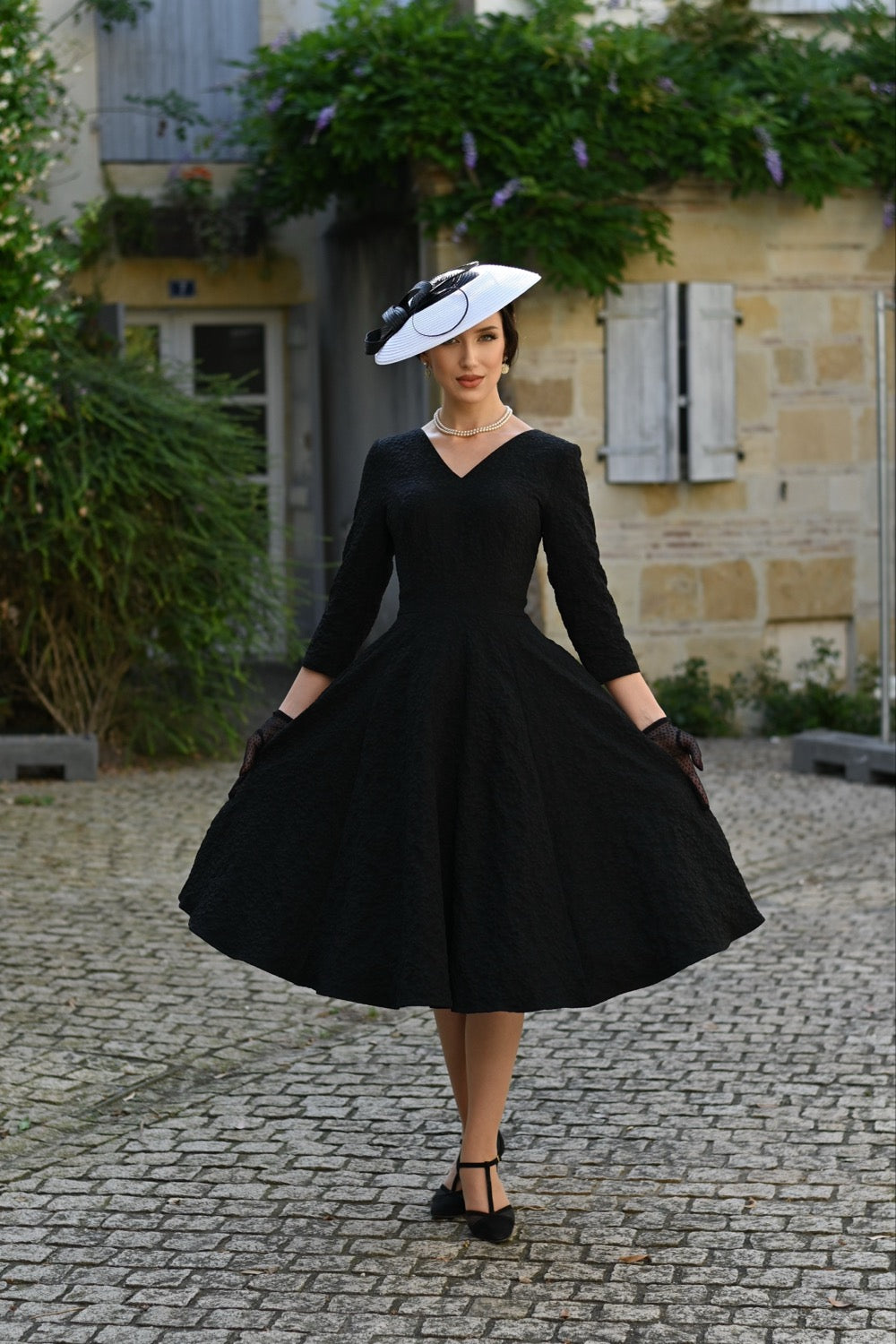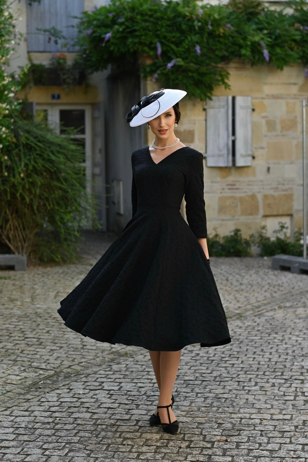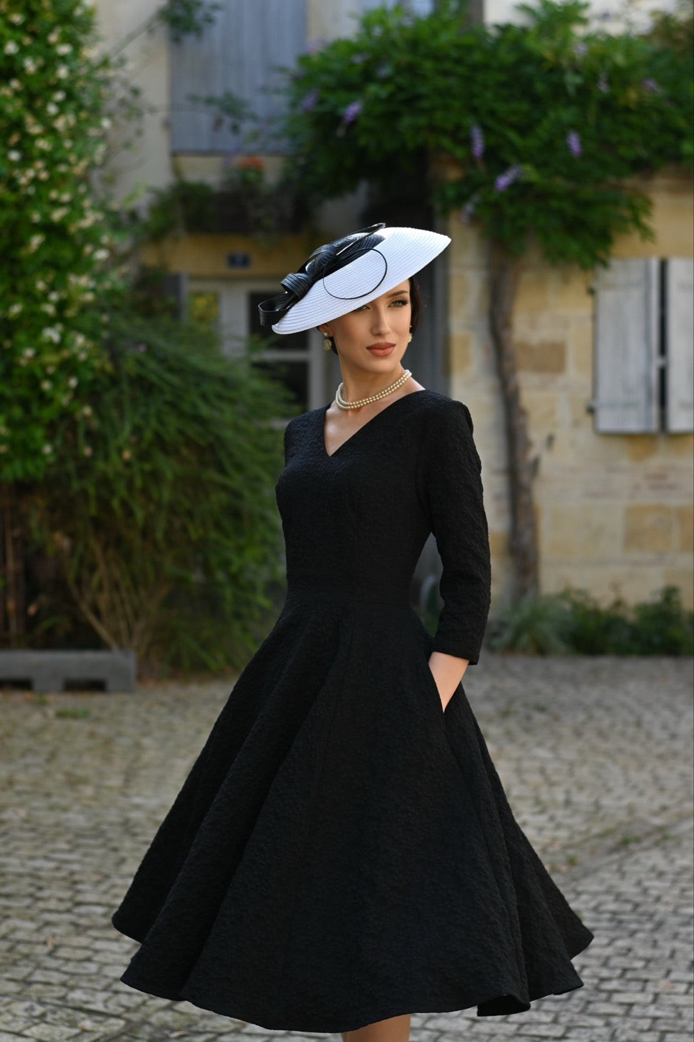 Designed with a flattering V-neckline and a defined waistband to enhance your silhouette, this dress offers both style and comfort. Thoughtful details include ¾ length sleeves, hidden side seam pockets, and a sleek hidden backzip for a smooth, polished finish. The swing silhouette adds graceful movement, making it perfect for both day and evening occasions.