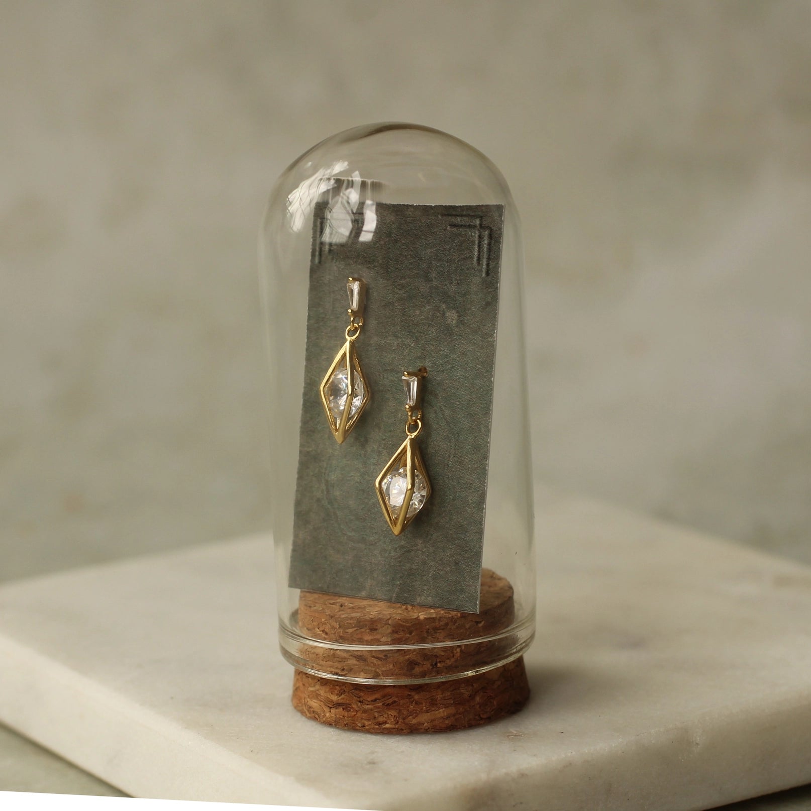 These beautifully understated dangle earrings feature a simple crystal jewel, caged inside a geometric rhombus formation. The metal is gold plated sterling silver (vermeil). The earrings measure 12mm in length, with the gold and crystal cage designed to hang just below the earlobe. These earrings come mounted on a linen presentation card.